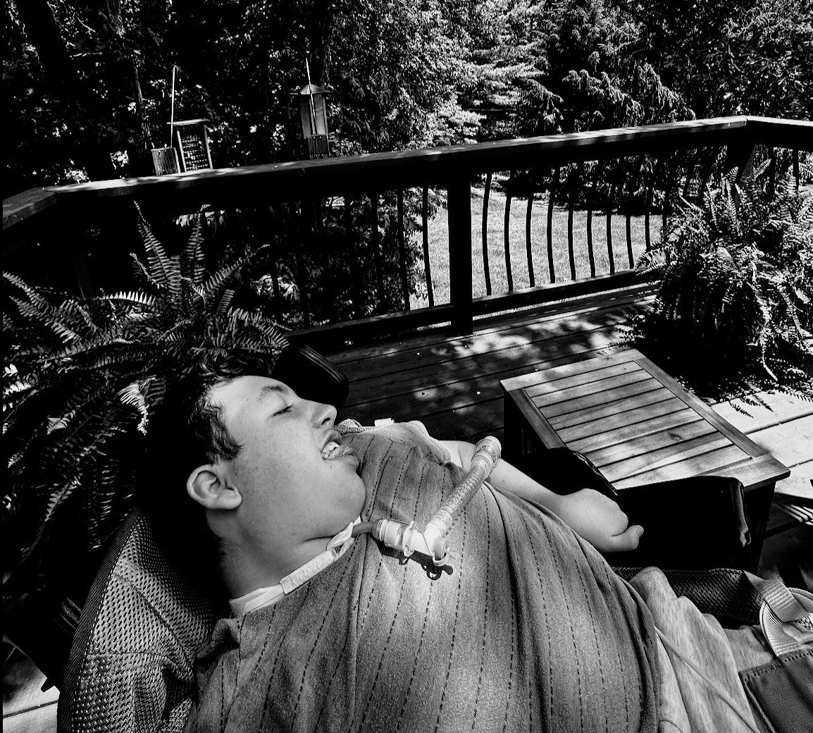 On the back deck, the breeze lifted his hair. I brought him out after hours of morning care - he was a trooper through all of it. Suctioning, diapering, meds, treatments, dressing, washing. Not exactly a fifteen-year-old's dream, I'm guessing.